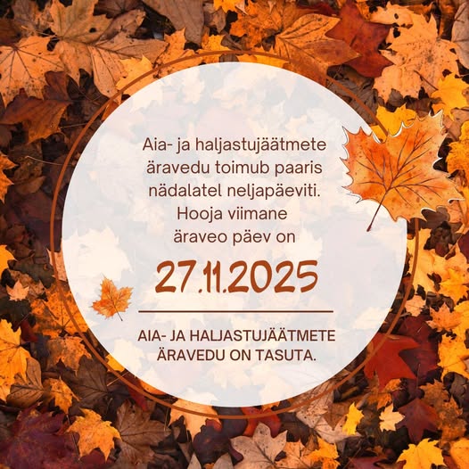 Kuni 27. novembrini saab aia- ja haljastujäätmeid ära anda Eesti Keskkonnateenused AS-i kaudu korraldatud jäätmeveo raames. Selleks: kogu aia- ja haljastujäätmed läbipaistvasse...