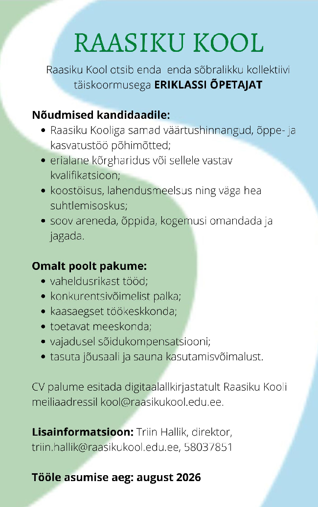Raasiku Kool otsib enda sõbralikku kollektiivi täiskoormusega ERIKLASSI ÕPETAJAT.