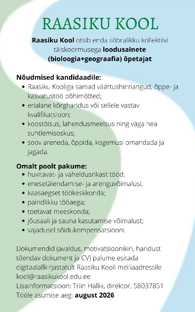 Raasiku Kool otsib enda sõbralikku kollektiivi täiskoormusega LOODUSAINETE (bioloogia + geograafia) ÕPETAJAT