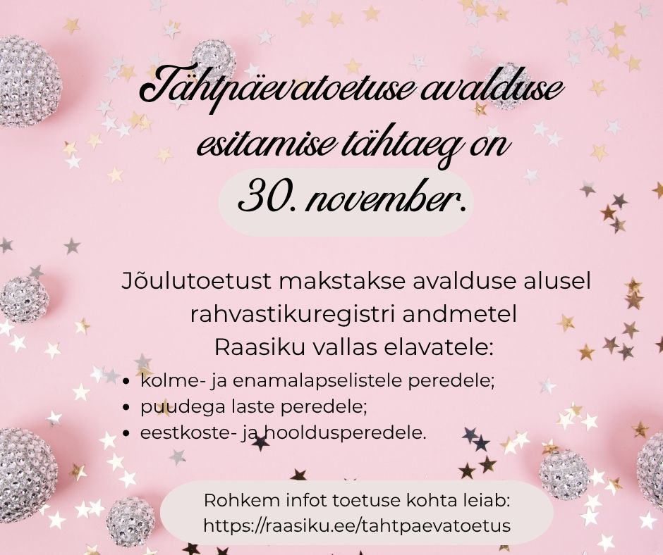 Jõulutoetust makstakse avalduse alusel rahvastikuregistri andmetel Raasiku vallas elavatele: